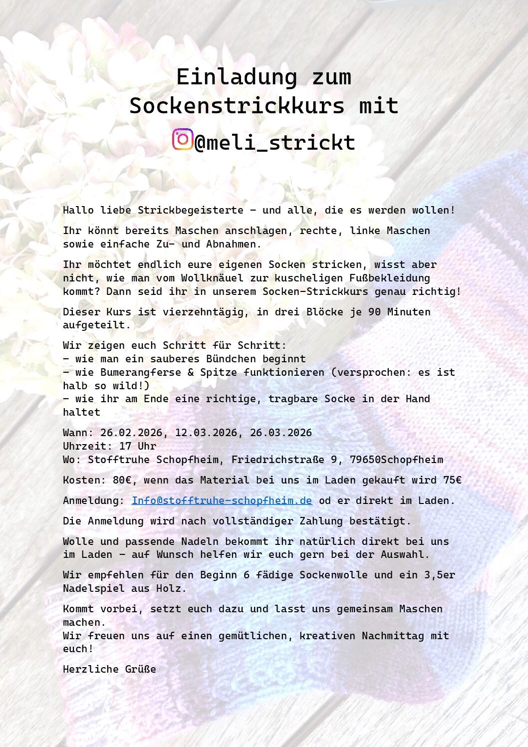 Anmeldung: Info@stofftruhe-schopfheim.de od er direkt im Laden.