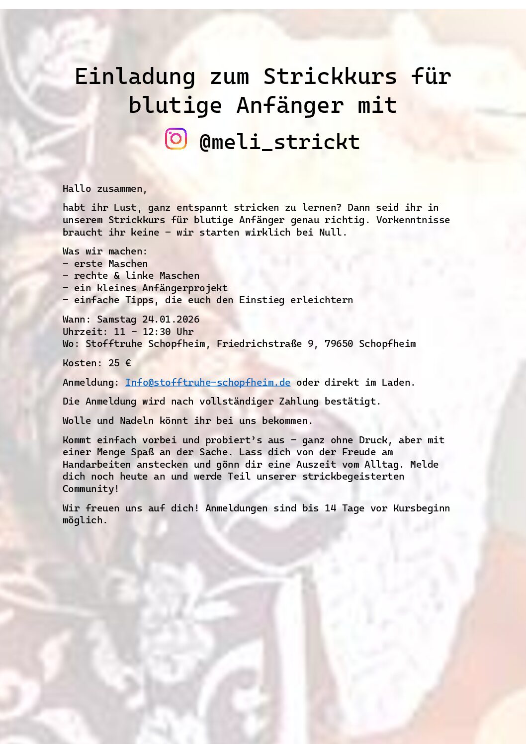Aktuell Strickkurs für blutige Anfänger mit meli_strickt von Inh. Simone Engelsberger 9. Januar 2026 Aktuell Maschen & Movies – Stricken im Kino von Inh. Simone Engelsberger 15. September 2025